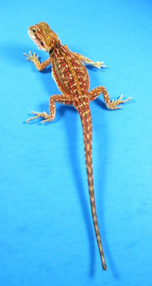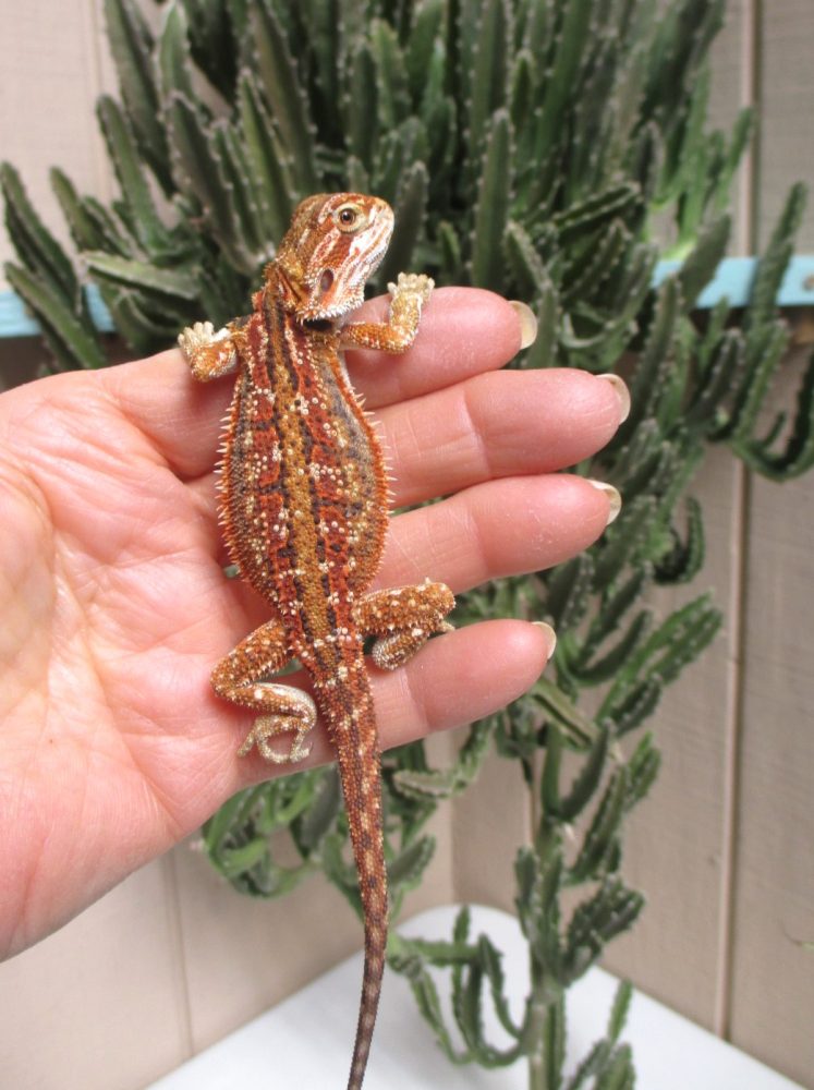 The dunner bearded dragons carry a design that is different than the traditional pattern of a bearded dragon. Dots and blotches are found on the back of the dragon between the normal shield pattern, along with lines and streak that run down the tail. The blotches are also found on the arms and legs of the dunner dragons and usually have conical scales. Check out our available dunner bearded dragons for sale below!