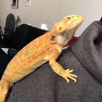 We are enjoying our beautiful bearded dragon that you bred, Donna. Donna appears to enjoy interacting with us. She sits still for petting, is calm when being picked up and held and we are now able to bring her outdoors with us on warm days. I thought you might enjoy seeing a current photo of her wonderful coloring. She’s even more brilliantly colored in person.